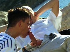 Muscled gay hunks wild threesome fuck out at the sea